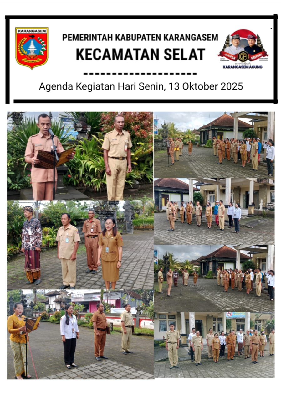 Senin,13 Oktober 2025 Bapak Camat Selat I Gusti Ngurah Dyumatsna,S.Sos.,MAP Meminpin Apel disiplin Kerja adapun arahan beliau Kepada seluruh Pegawai ASN,PPPK dan Non... Baca Selengkapnya